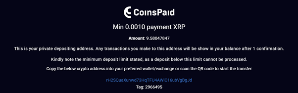 4. If you deposit with XRP currency you need to specify memo tag additionally (at the very bottom). It should be entered in your crypto-wallet and everyone will have a different one.