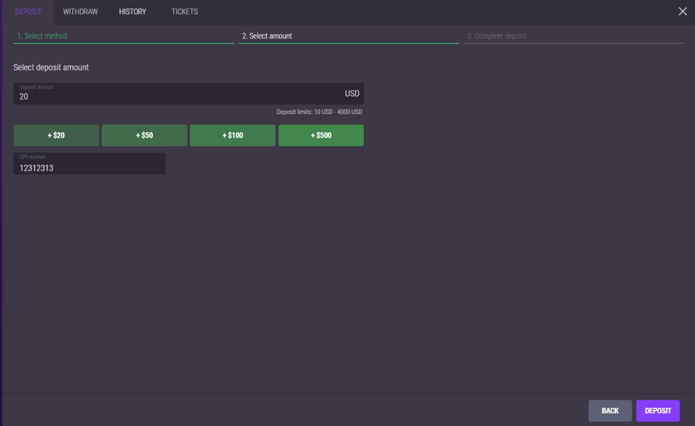 3. Choose the amount to deposit in dollars, your CPF number and click on “Deposit”.