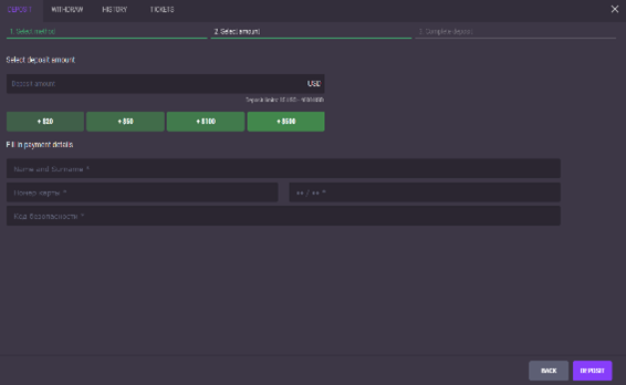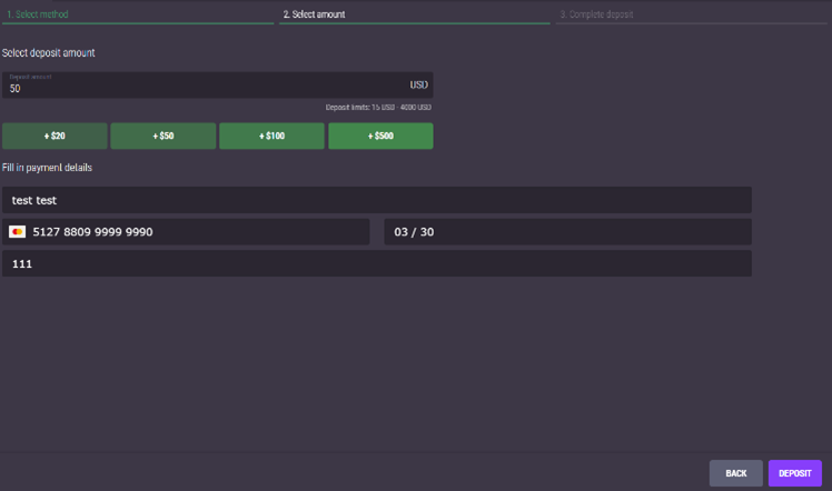 3. Enter the deposit amount in dollars and your data (First and Last name as on the card, card number, card expiration date and security code) and click on deposit.
